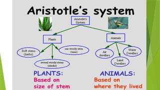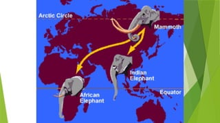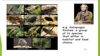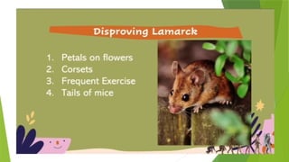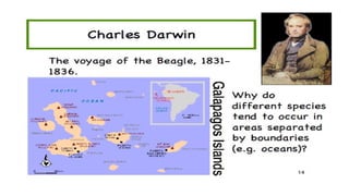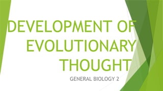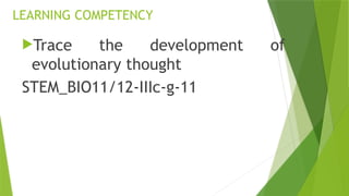 The document outlines the historical development of evolutionary thought, highlighting key figures and their contributions from Aristotle to Charles Darwin. It discusses concepts such as gradualism, the theories of Lamarck on use and disuse, and the concept of natural selection by Darwin and Wallace. Overall, it traces how ideas about the mechanisms of species evolution have evolved over time.