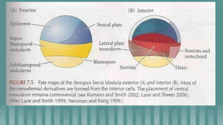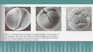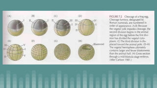 3. Cleavage and blastulation occur, forming a blastula. Gastrulation then transforms the blastula into a three-layered embryo through invagination, involution, and epiboly.