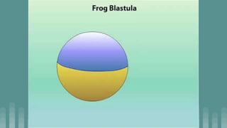 1. The document summarizes the development of frog sperm, eggs, fertilization, and early embryonic development. It describes how the male and female frogs mate and the structure of their sperm and eggs.