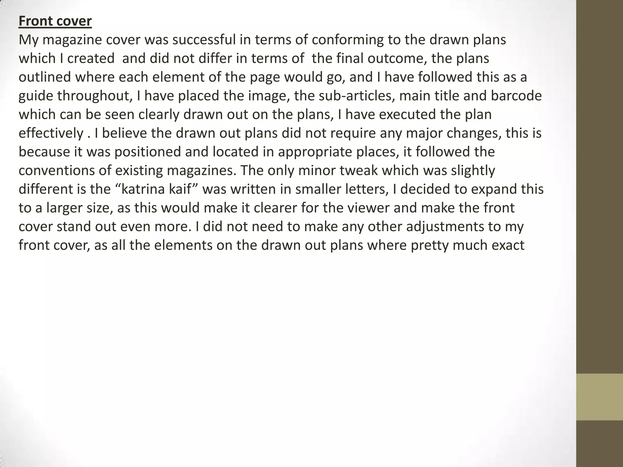 The front cover was executed according to the original plans with only minor adjustments. The main title was enlarged to stand out more clearly. The contents page followed the plans except the title was moved to the left for improved appearance. The double page spread differed in locating the quote on the left page for better visibility and adding color coding to the interview for clarity, but kept the full page image as planned.