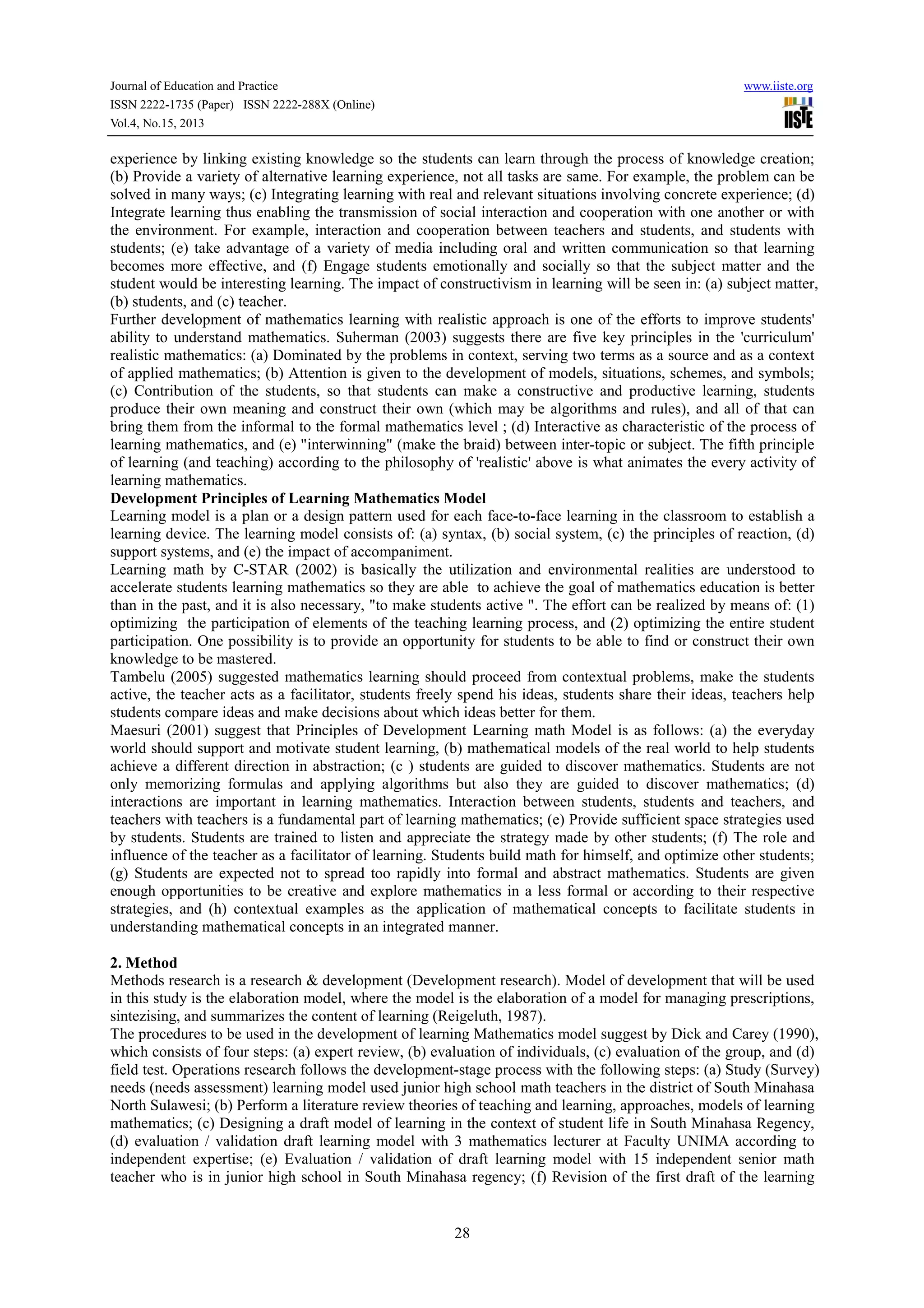 This document discusses the development of a mathematical learning model based on contextual teaching approaches for schools in South Minahasa Regency, Indonesia. It reviews theories of constructivism, contextual teaching and learning (CTL), and realistic mathematics education (RME) that inform the components of the new model. The model was developed using a multi-stage process that included expert review and evaluations. Analysis found the content and constructs of the new contextual and realistic (KCR) mathematical learning model to be valid based on reviewer feedback.