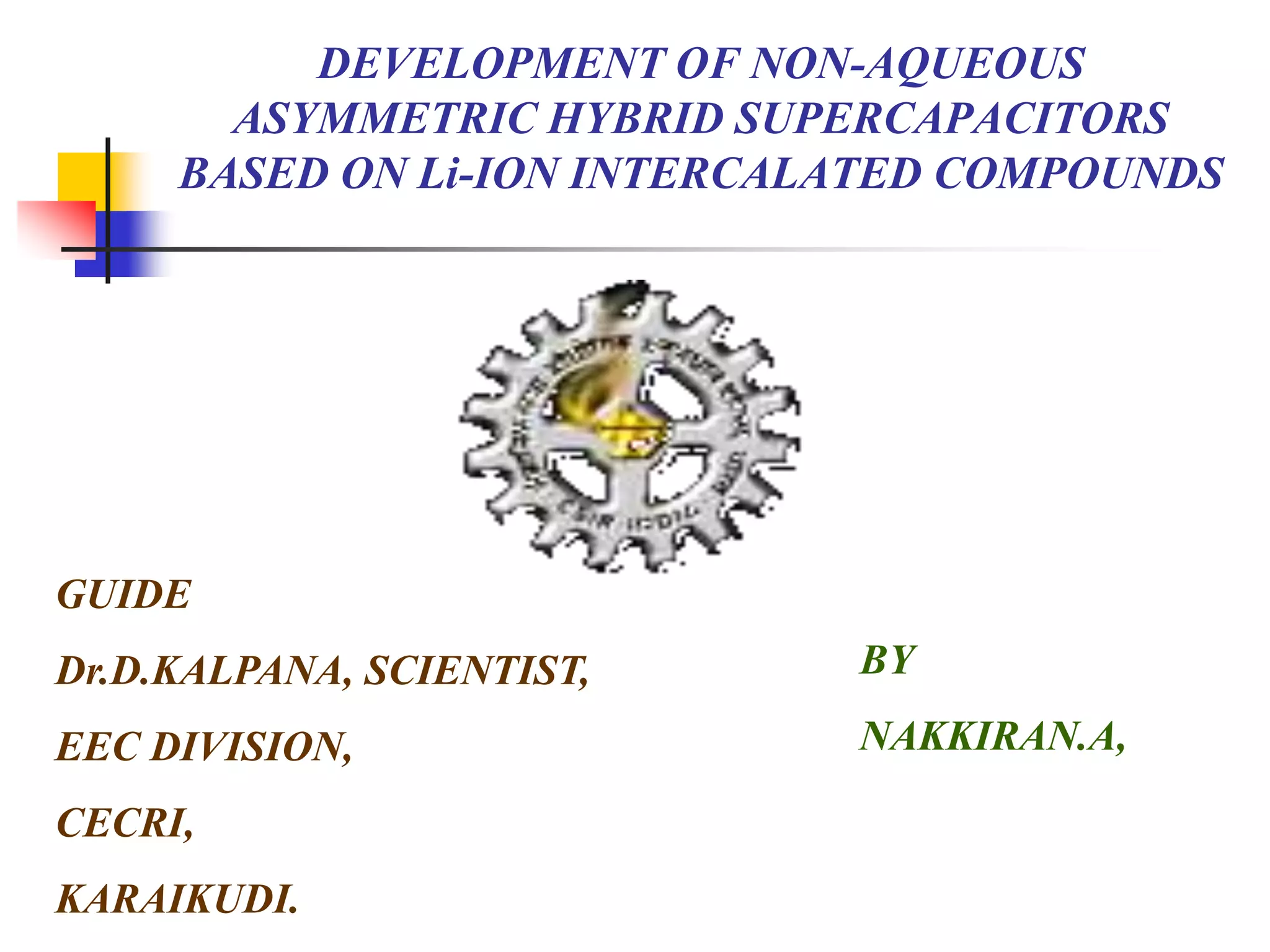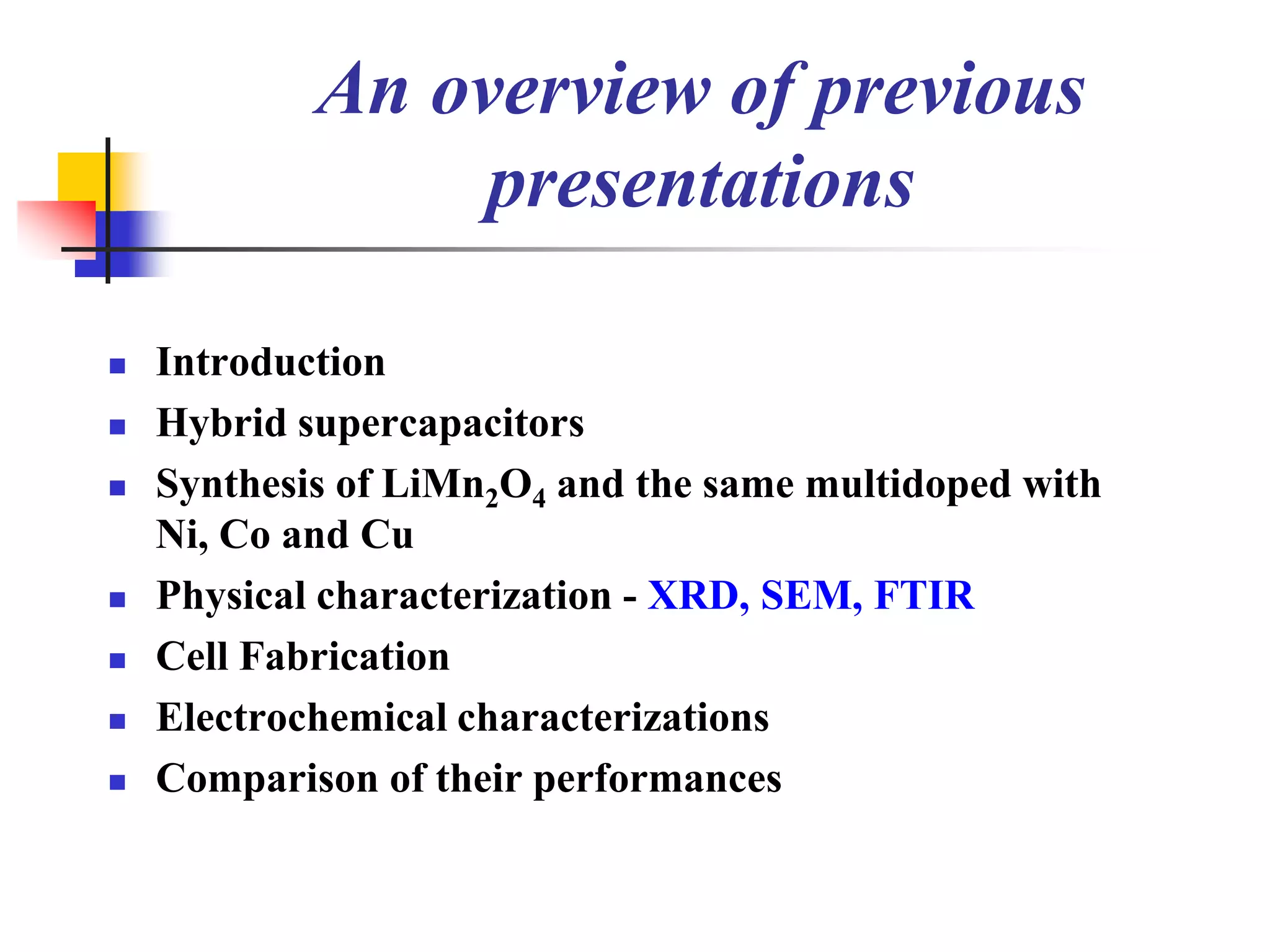 The document describes research on developing asymmetric hybrid supercapacitors based on lithium-ion intercalated compounds. Specifically, it discusses synthesizing cathode materials of pure LiCoO2 and LiCo1-xAlxO2 with varying amounts of aluminum doping (x=0, 0.2, 0.4, 0.6). The materials were characterized using techniques like thermal analysis, X-ray diffraction, and Fourier transform infrared spectroscopy. Electrochemical characterization of the materials was also performed through cyclic voltammetry and charge/discharge testing to evaluate their performance in supercapacitors.