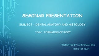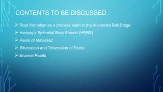 This seminar presentation discusses root formation in teeth. It begins by outlining the contents to be covered, including the role of Hertwig's Epithelial Root Sheath (HERS) in root development. HERS is an extension of the enamel organ that induces the differentiation of dental papilla cells into odontoblasts. As root formation progresses, remnants of HERS remain in the periodontal ligament as Rests of Malassez. Bifurcation and trifurcation of roots occurs due to differential growth of the epithelial diaphragm in multi-rooted teeth. Enamel pearls may form if epithelial root sheath cells remain on the dentin surface and differentiate into ameloblasts