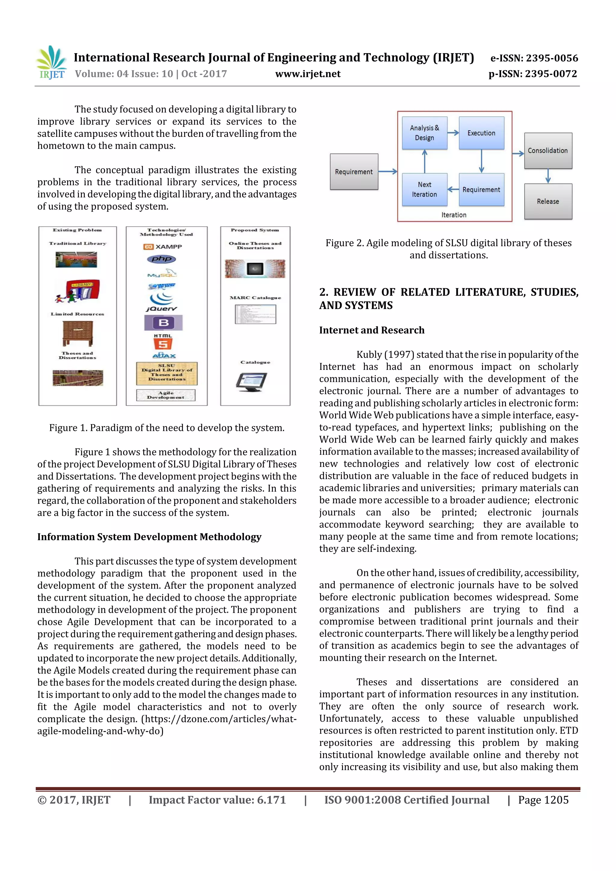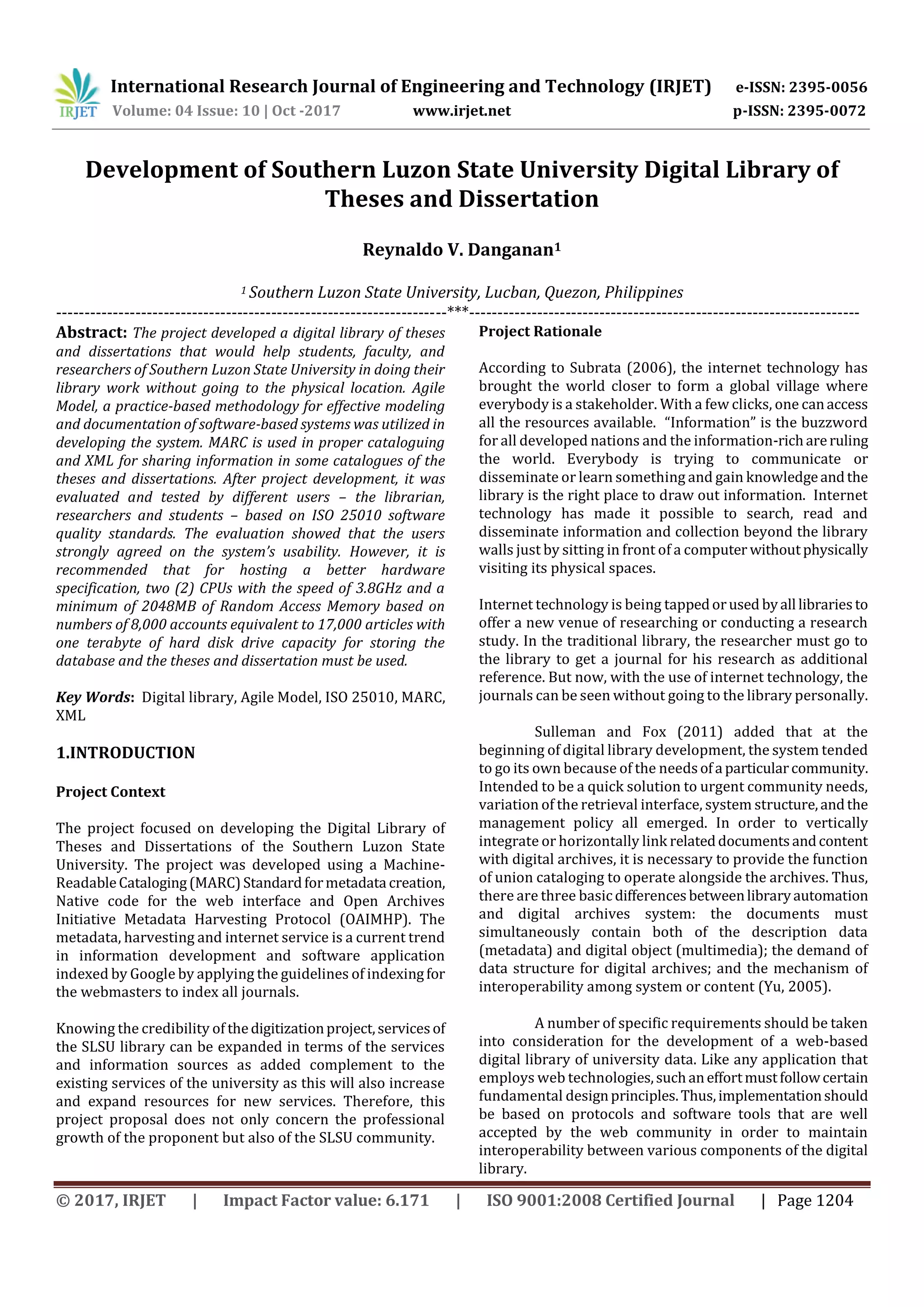 This document describes the development of a digital library of theses and dissertations at Southern Luzon State University. The system was developed using an agile model methodology and utilizes MARC for metadata creation and XML for information sharing. The system was evaluated based on ISO 25010 software quality standards and users strongly agreed it was usable. However, for better performance the document recommends using a server with higher specifications to support more accounts and articles being stored in the system.