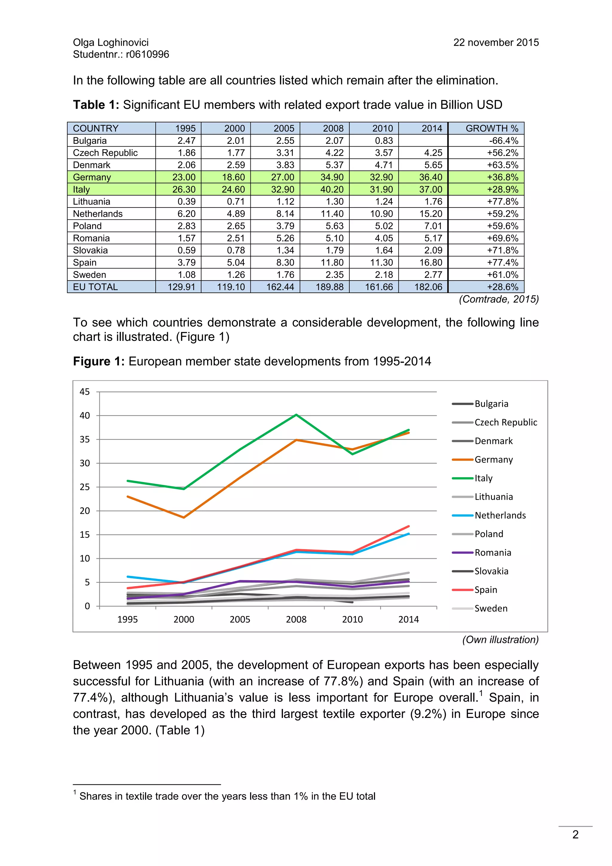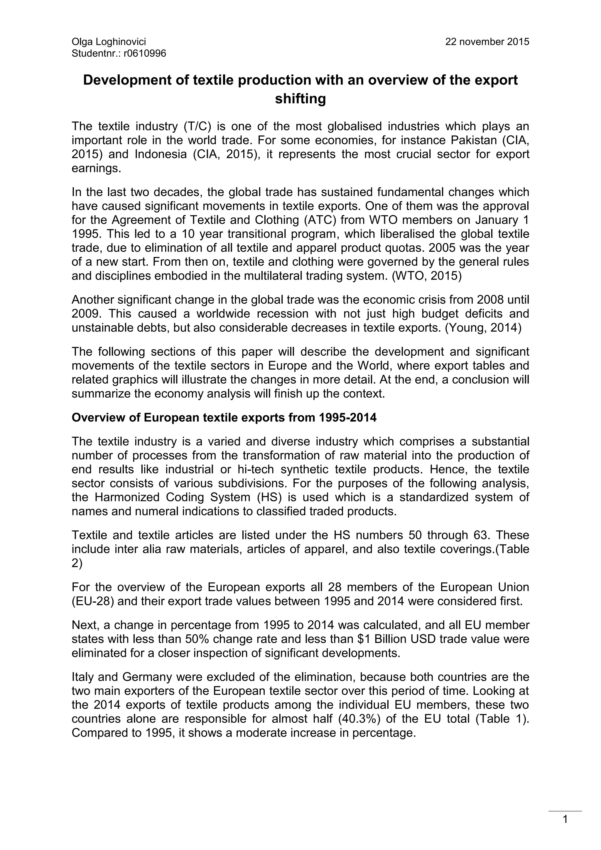 The document discusses the development of the global textile production industry, highlighting its significance and changes in export patterns from 1995 to 2014, particularly after the WTO's Agreement on Textiles and Clothing in 2005. It emphasizes the shifts in export values among various countries, with notable growth in Asian countries like China and Vietnam, while some European countries demonstrated moderate growth despite economic crises. The conclusion indicates a general trend of textile production moving towards Asian economies and Spain within Europe, while countries like Romania and Korea experienced declines in their textile export significance.