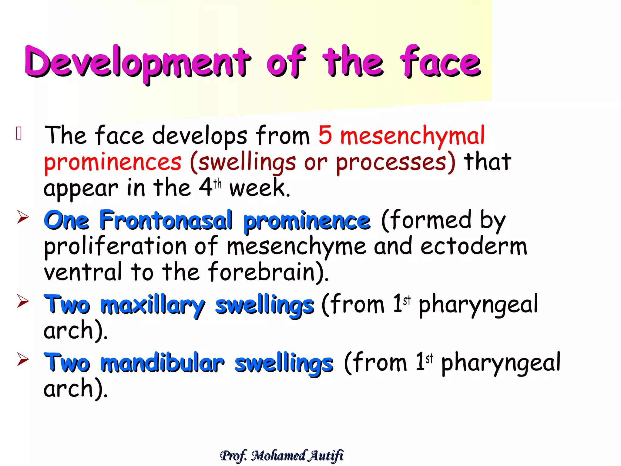 The document summarizes the development of the face, nose, palate, nasal cavities, and pituitary gland from the 4th week of development. It describes how the face develops from 5 mesenchymal prominences that surround the primitive mouth. It then discusses the development of specific structures such as the lips, salivary glands, nose, palate, and nasal cavities from these prominences. The pituitary gland is noted to develop from the ectoderm of the roof of the stomodeum and floor of the diencephalon. Some congenital anomalies are also briefly mentioned.