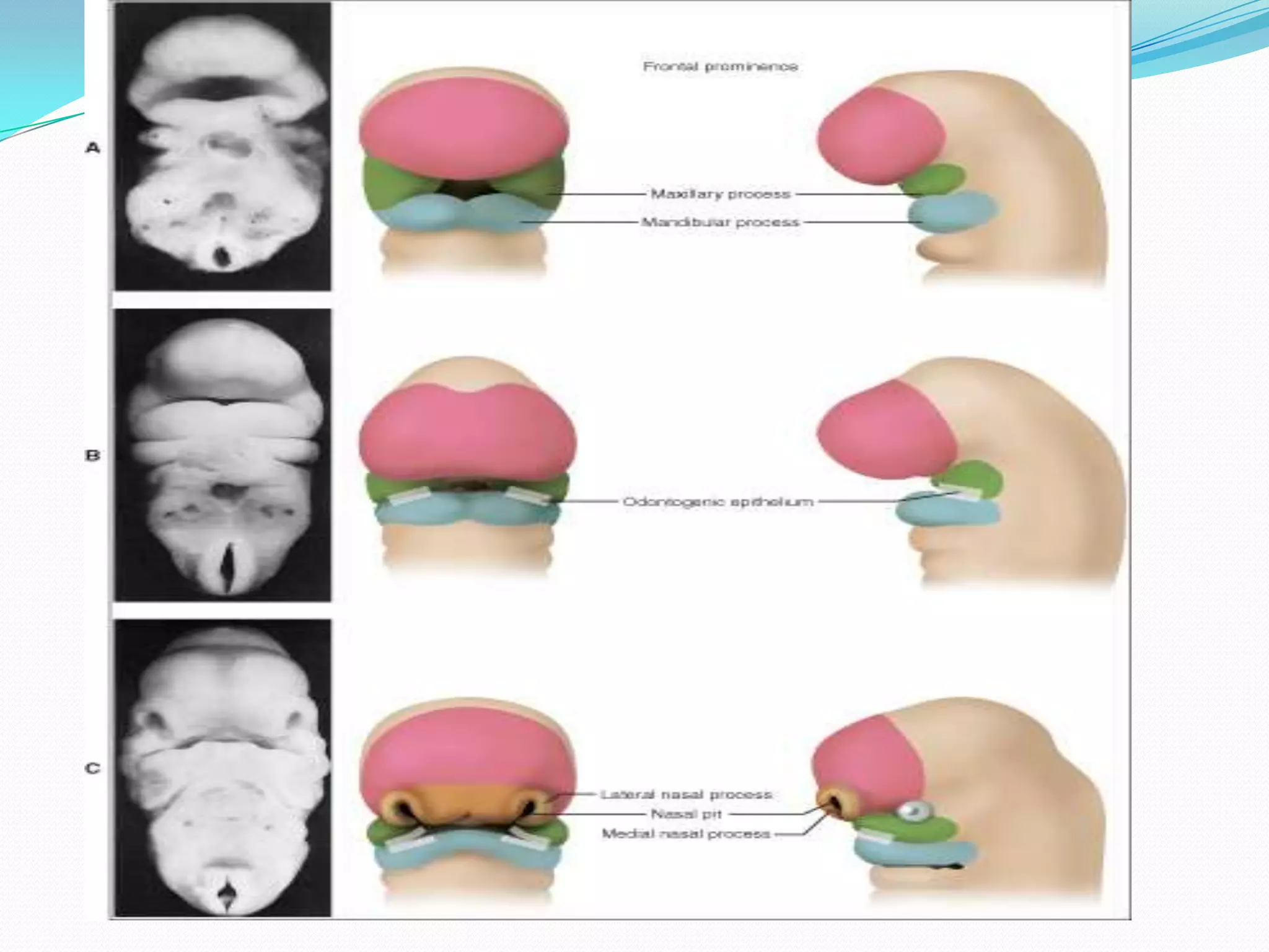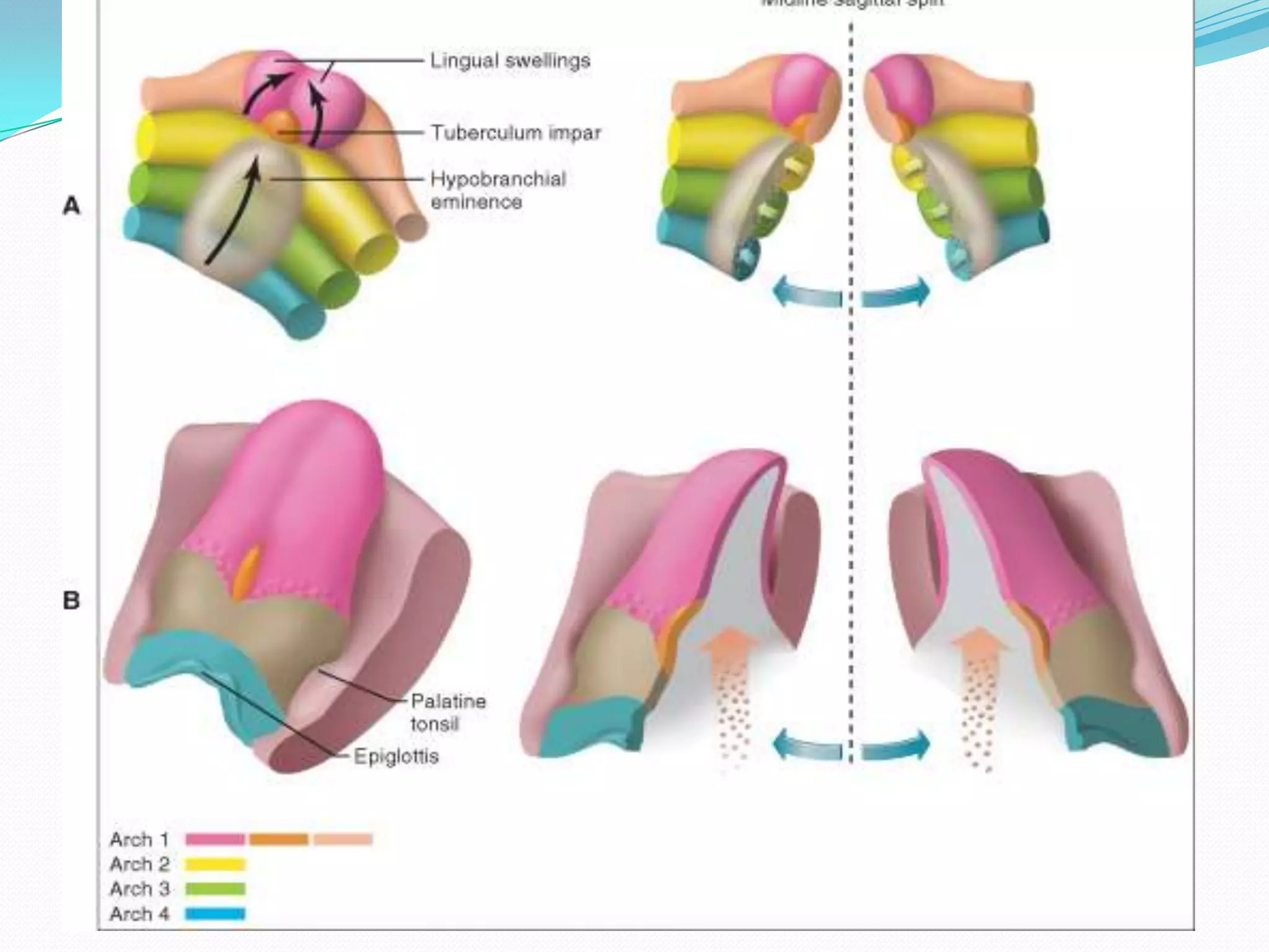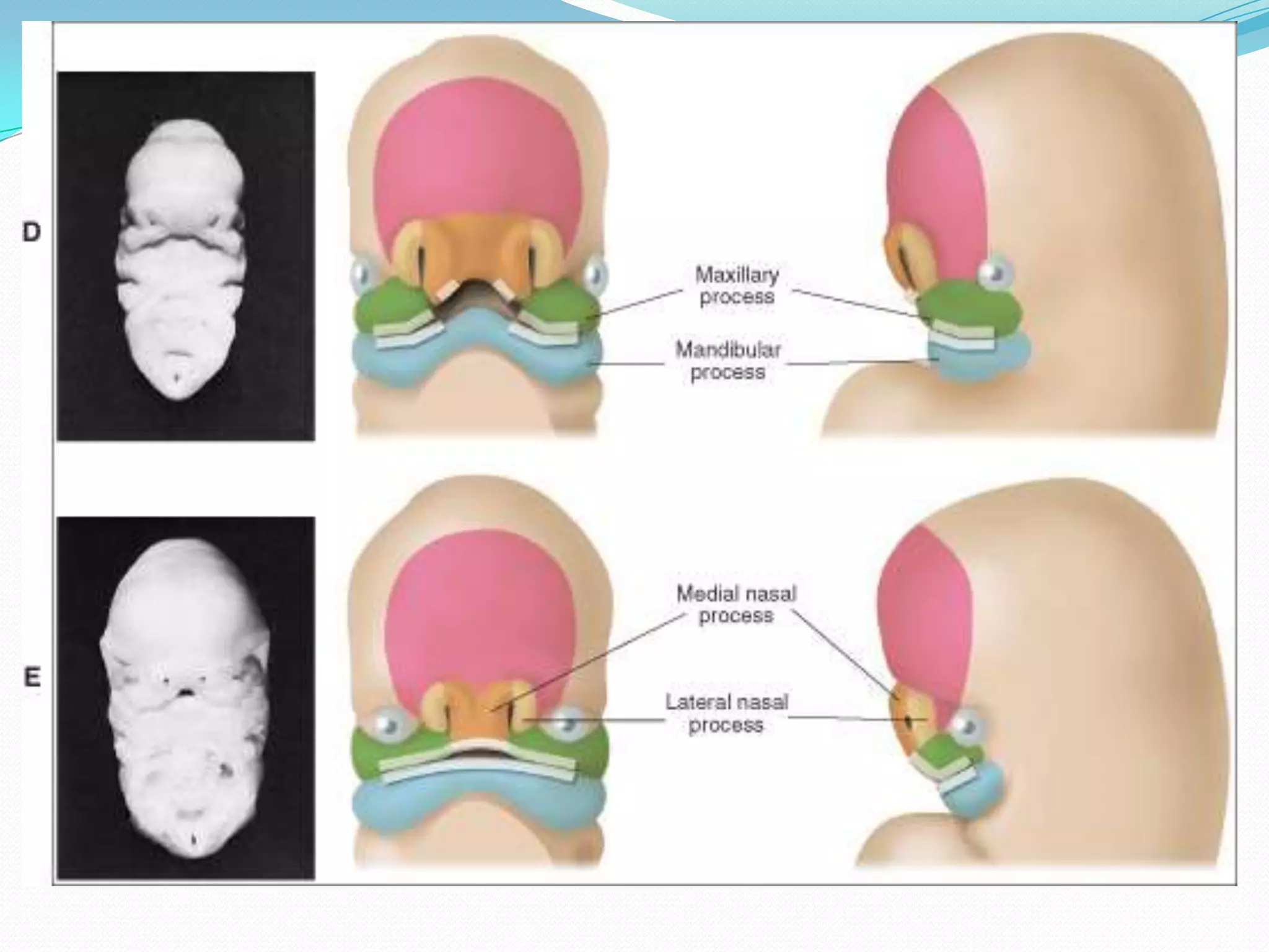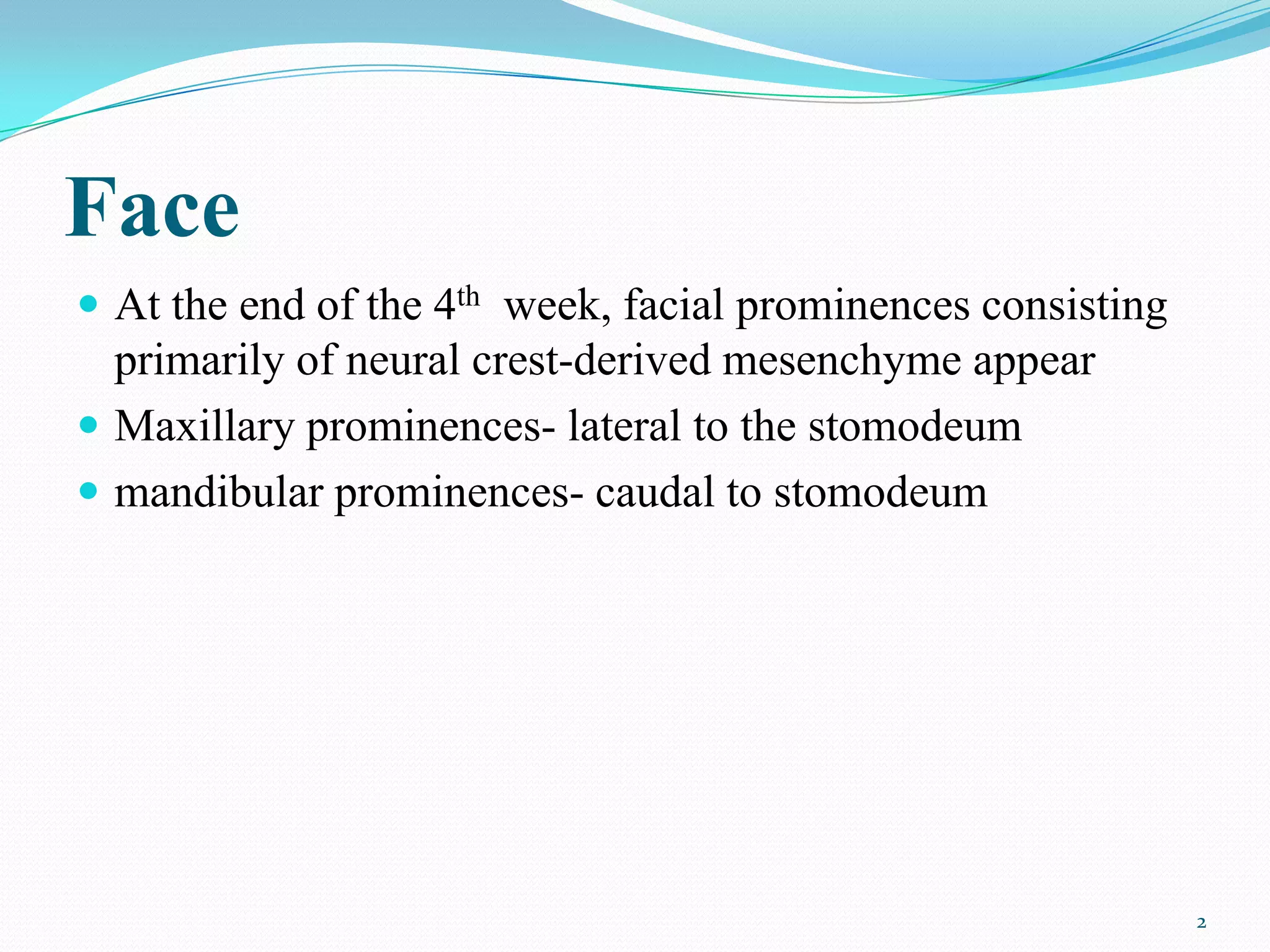 The document summarizes the development of the face and its structures from the 4th to 7th weeks of gestation. It describes how facial prominences like the maxillary and mandibular prominences form and contribute to structures like the upper lip, nose, and palate. It also discusses the development of the tongue from lingual swellings and how various nerves innervate parts of the developing face and tongue.