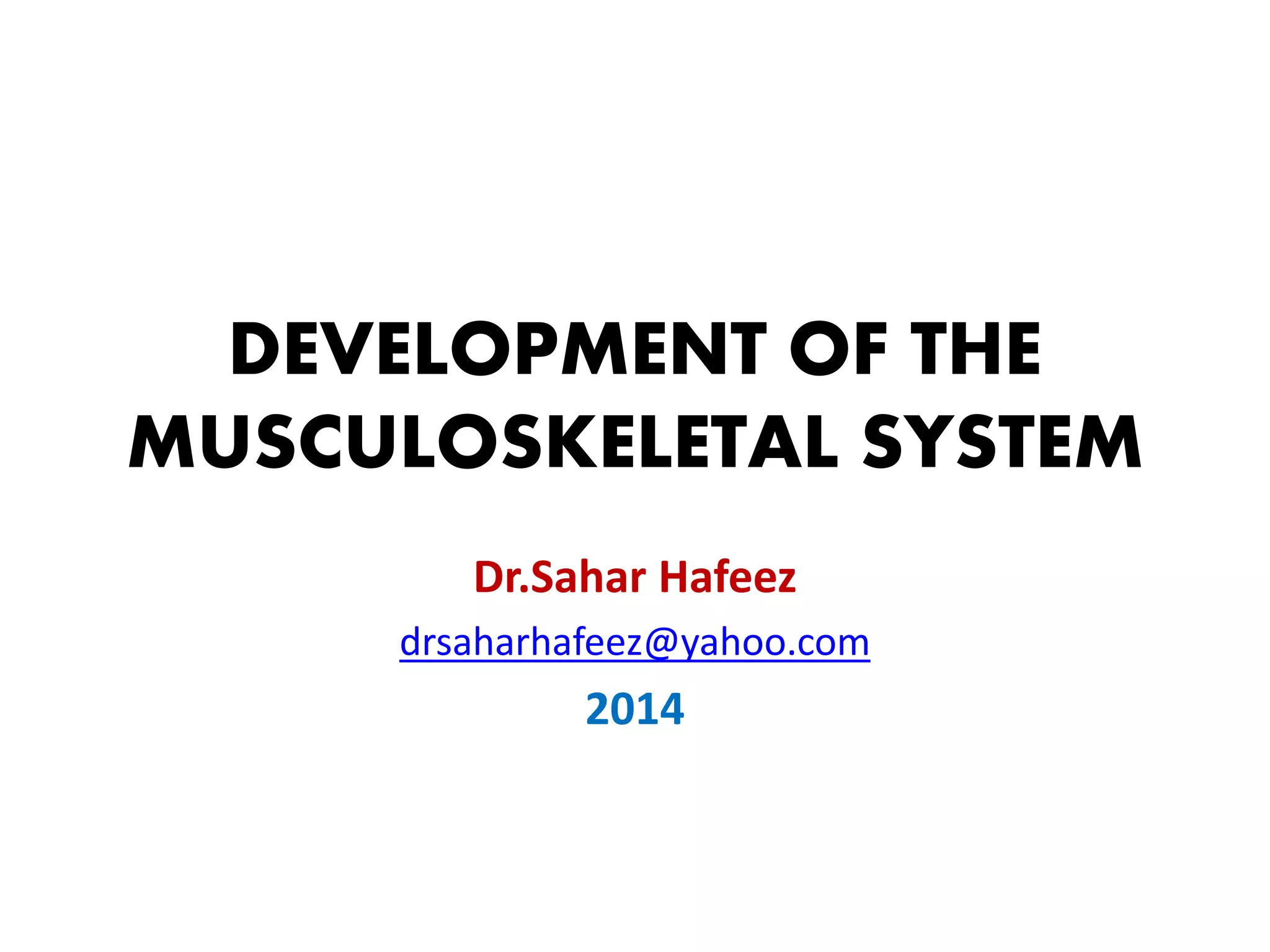 The document summarizes the development of the musculoskeletal system from early embryonic stages. It discusses how the skeletal and muscular systems originate from mesoderm and the processes of ossification and myogenesis. Key events include the formation of somites which differentiate into sclerotome and dermomyotome, the development of limb buds and their rotation, and the segmentation of axial musculature into epimere and hypomere. The document provides an overview of the embryonic development of the skeletal and muscular systems.