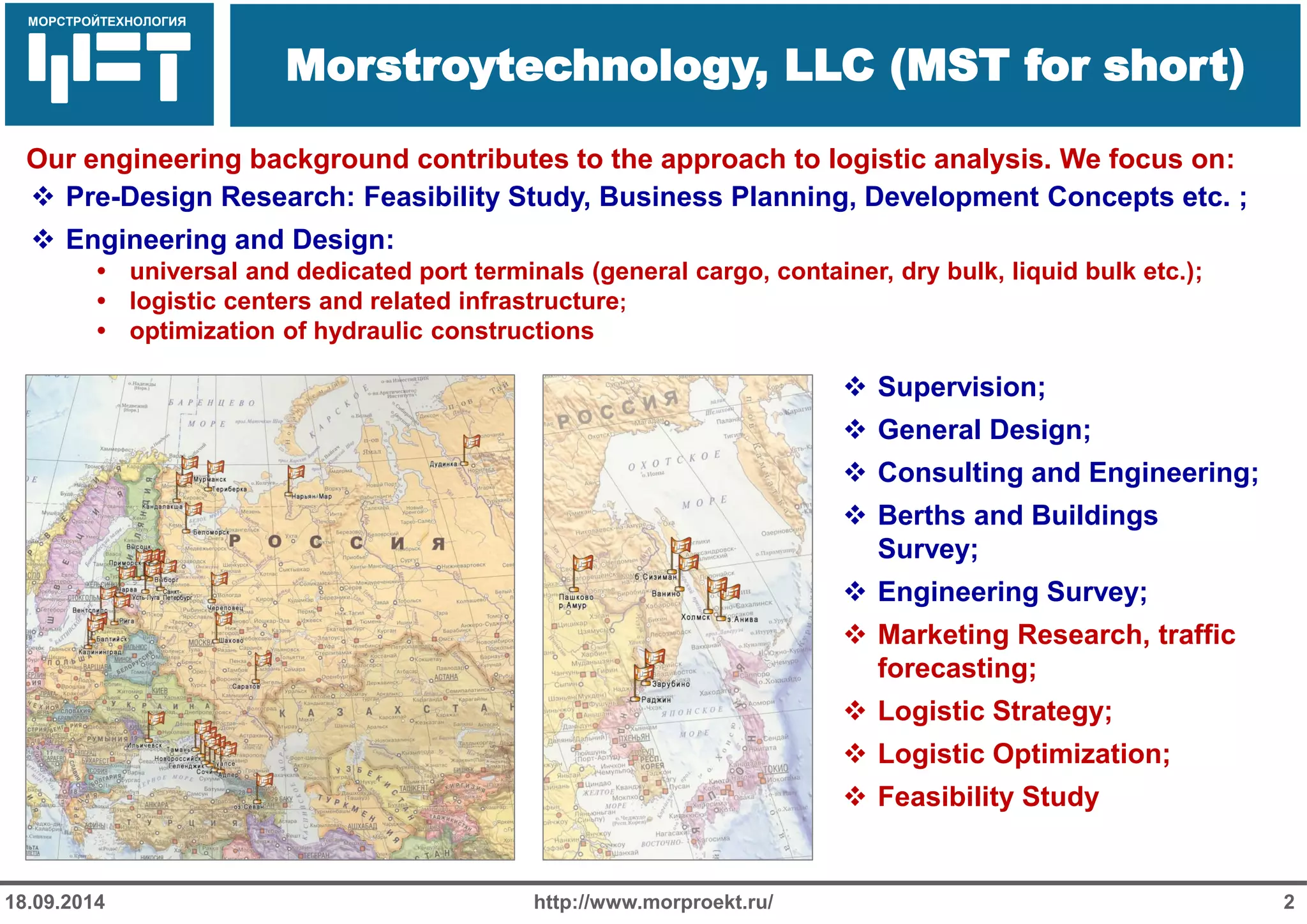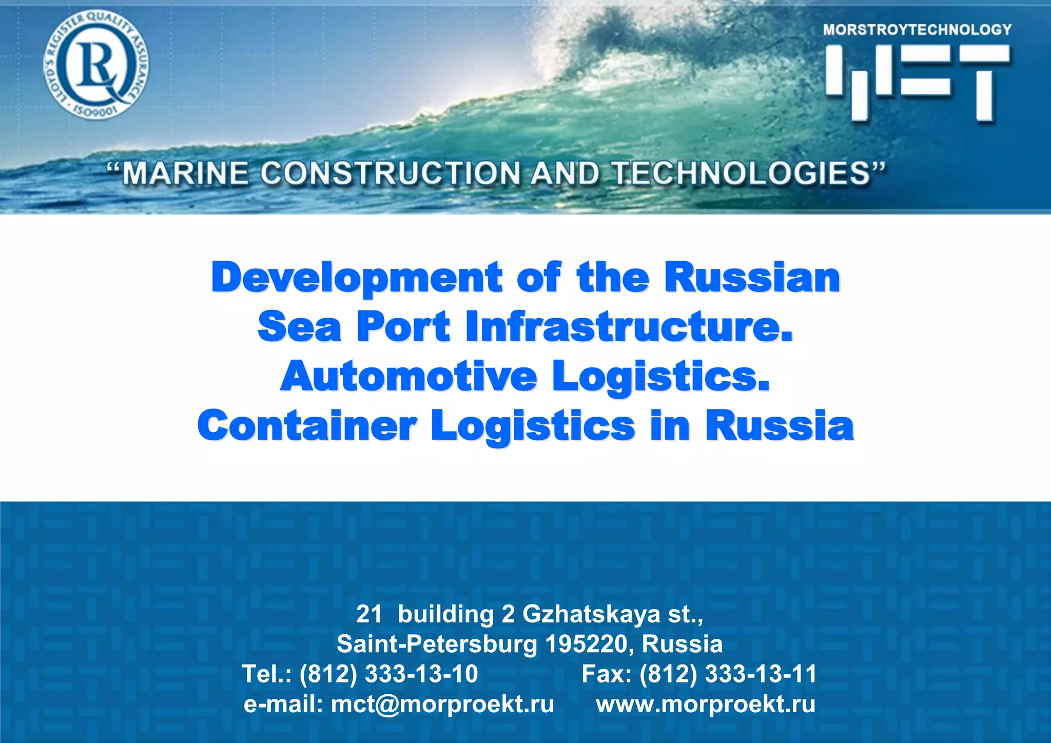 This document discusses Russian port infrastructure and logistics. It provides an overview of cargo flows through major Russian ports in 2013. The largest cargo types by volume were oil and oil products (56.8% of total cargo). It also outlines key development projects aimed at expanding port capacity for containers and other cargo in major ports like St. Petersburg, Ust-Luga and Primorsk. Additionally, it reviews the modal split of cargo transportation to and from ports, with rail being the dominant mode.
