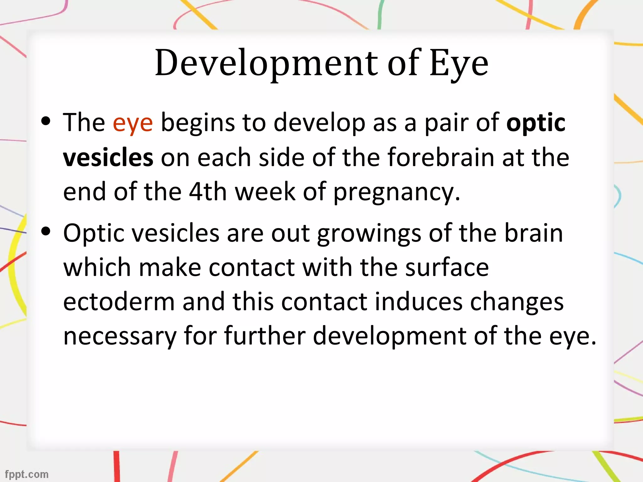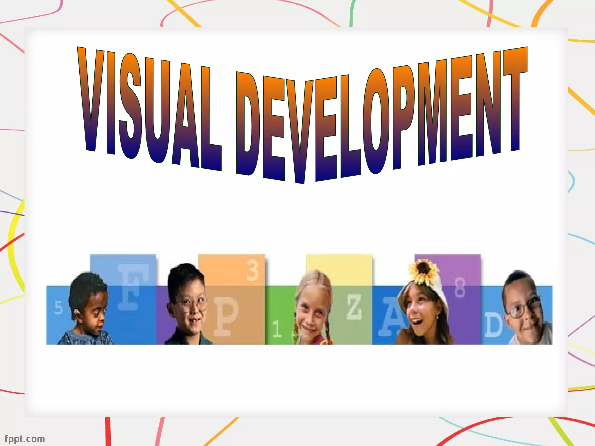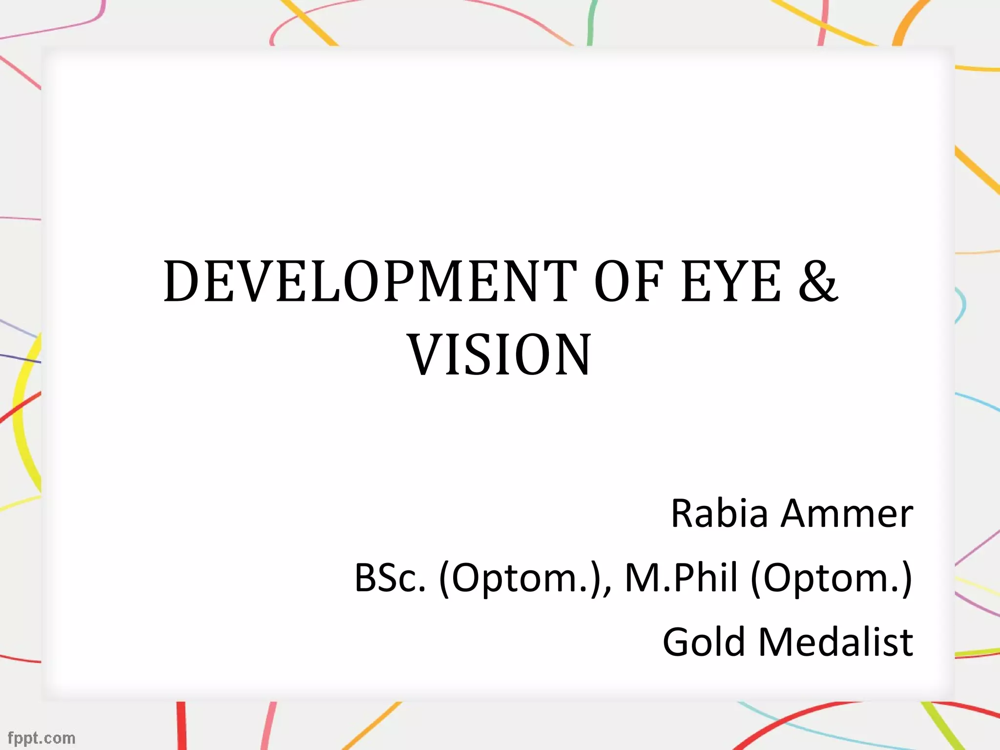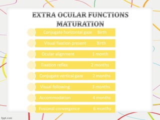 The document summarizes the development of the eye and vision from conception through early childhood in humans. It describes how the eye begins forming in the 4th week of pregnancy as optic vesicles and develops layers from various tissues. After birth, the eyes continue developing, with the lens thinning and visual acuity improving over the first few years as the retina matures and coordination increases. Major developmental milestones are seeing faces at 1 month, following objects at 3 months, and normal vision being achieved by ages 2-3 years.