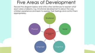 This document provides an overview of child development from conception through adulthood. It discusses the key aspects of development, including physical, social, emotional, cognitive, and language development. Child development follows general sequences and principles, growing in complexity over time as children achieve different milestones. Understanding development helps ensure children's needs are met and they become well-adjusted adults.
