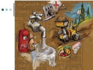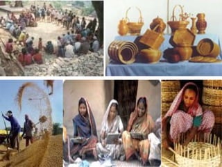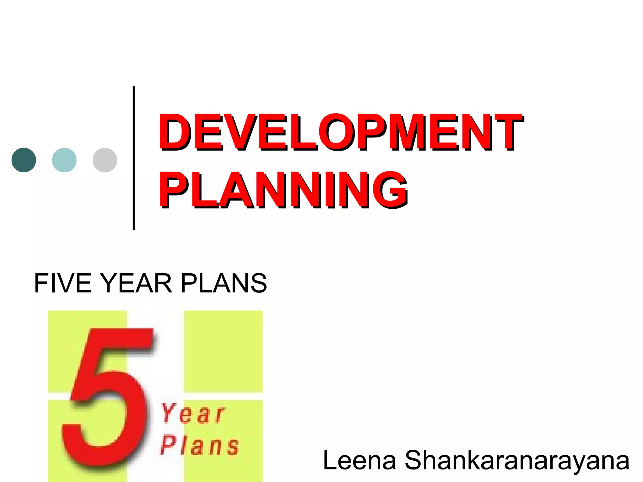 The document discusses India's development planning through five-year plans initiated by the Planning Commission since 1950, focusing on economic growth, modernization, self-reliance, and equity. It outlines the objectives and achievements of each five-year plan, detailing major focuses such as agriculture, industrialization, and poverty alleviation over various periods. The plans seek to balance public and private sector contributions while addressing long-term and immediate economic challenges.