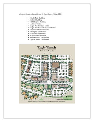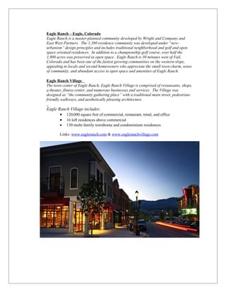 Eagle Ranch is a 1,800 acre planned community in Eagle, Colorado developed by Wright and Company and East West Partners. It includes 1,380 homes built with new urbanist design principles, as well as a golf course and over half the land preserved as open space. Eagle Ranch Village is the town center, with shops, restaurants, and other amenities designed to be pedestrian-friendly. Tahoe Mountain Resorts, developed by East West Partners, includes luxury communities in North Lake Tahoe with amenities like golf courses, fitness facilities, and dining.