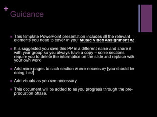The document provides guidance for a music video assignment, including templates for a presentation covering pre-production tasks like generating video ideas, selecting a song, developing a treatment, and assessing the production's viability through a budget, schedule, equipment and location needs, and personnel requirements. Students are asked to fill in details of their proposed music video concept and planning in the presentation templates provided.