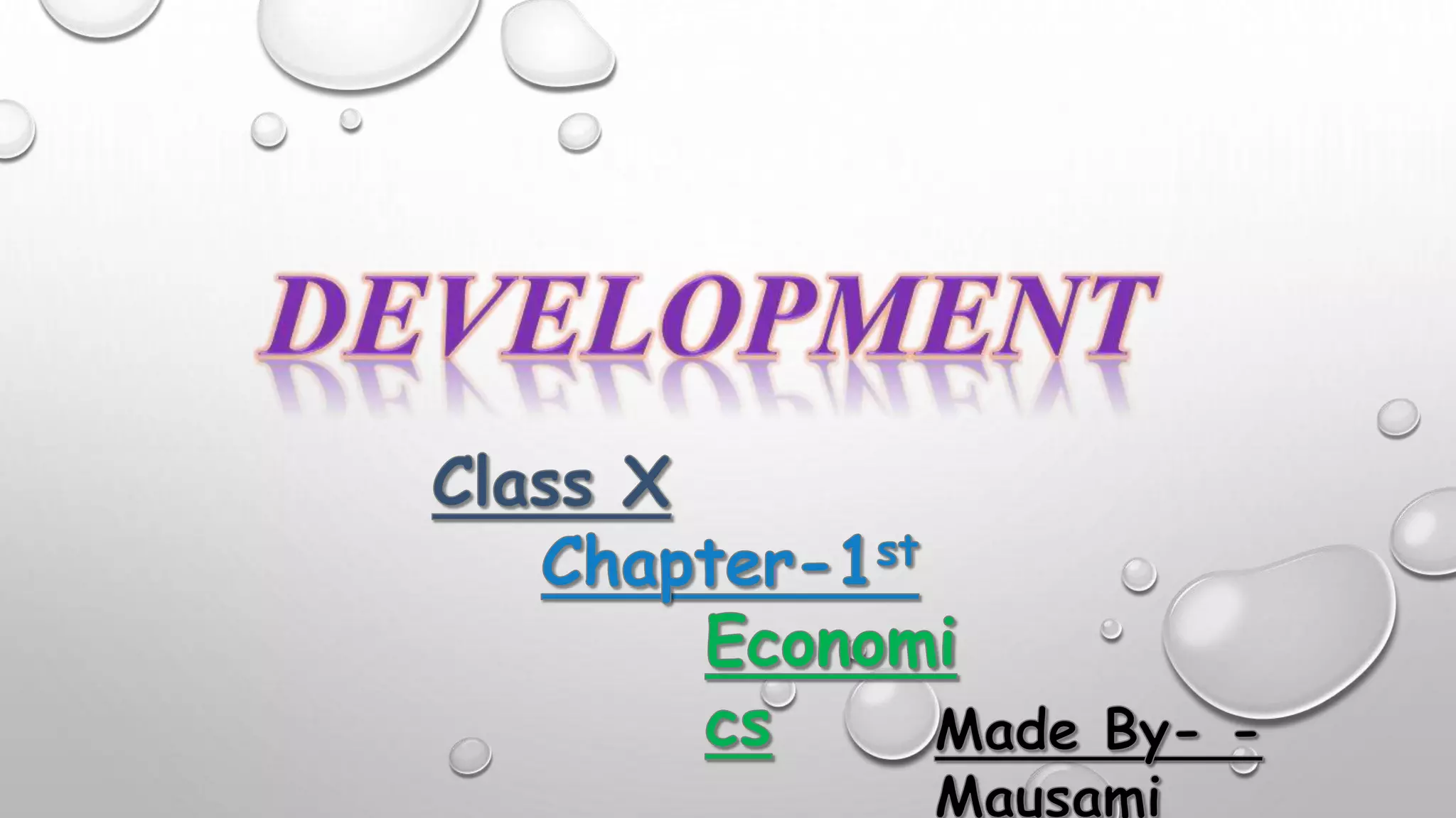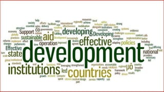 This document discusses different concepts related to development including definitions of development, goals of development, measuring development at national and individual levels, and sustainable development. It defines development as the process of growth and maturity over time. National development is measured using metrics like per capita income, literacy rates, and life expectancy. Sustainable development aims to manage resources in a way that maintains long-term wealth and well-being.