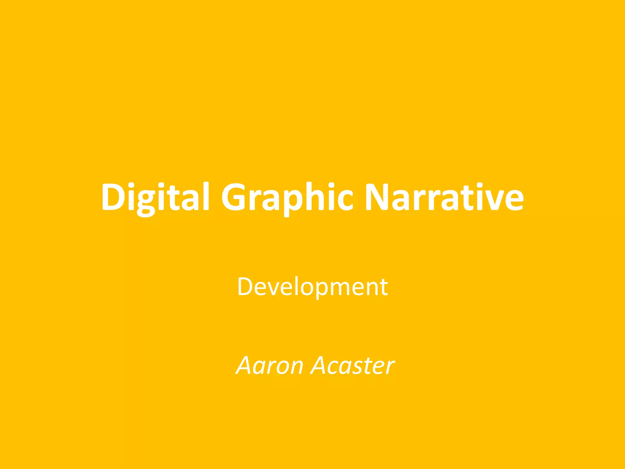 The document outlines Aaron Acaster's digital graphic narrative development project, in which he completes various exercises including shape tasks, rotocoping, film quotes, text-based images, comic books, photo stories, and illustrations. For each exercise, Aaron provides an evaluation of what he liked about the image and how he could improve if doing the project again. He demonstrates progress in developing his digital graphic skills through multiple creative assignments.