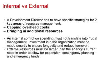 Small nonprofits can multiply resources and control costs through various internal and external strategies. Internally, they can utilize volunteers, interns, and retired community members to minimize workforce costs. Externally, they can leverage free or low-cost technologies like Skype, LinkedIn, and social media for communications, networking, and publicity. Nonprofits should also diversify their funding sources, explore corporate donors and foundations, engage individual donors through sponsorship programs and donor perks, and consider co-working spaces to reduce overhead costs.