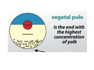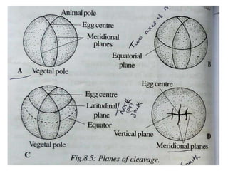 - Cleavage patterns in early embryos, including holoblastic vs meroblastic cleavage. Cleavage planes like meridional, vertical, equatorial and latitudinal are also defined.