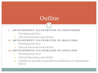 The document describes developmental patterns in several animal phyla. It discusses: