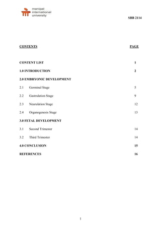 This document describes the key stages of human embryonic and fetal development. It begins with an introduction to embryology and the processes of gametogenesis that produce egg and sperm cells. There are then four main sections that outline the major developmental periods: 1) Germinal stage, which involves fertilization, cleavage of the zygote, and blastulation. 2) Gastrulation stage, where the embryo reorganizes into three germ layers. 3) Neurulation stage where the neural tube forms from ectoderm. 4) Organogenesis stage in which organs begin to form and differentiate. The document then describes fetal development in the second and third trimesters, focusing on continued growth and differentiation of organ systems.