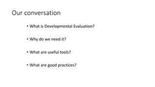 Developmental Evaluation is an analytical approach that uses information collection, sense-making and evidence-based decision support to facilitate adaptive management of complex social programs and interventions. It is needed because development challenges are often "wicked problems" that are complex with unclear boundaries and unpredictable dynamics. Developmental Evaluation uses tools like Most Significant Change narratives, dashboards, and sentinel indicators to help platforms and partners continuously learn and adapt their approaches over time in response to changes in these complex systems. Good practices for Developmental Evaluation emphasize using multiple methods at different scales, facilitating intentional learning discussions, balancing rigor with useful information, and fostering partnerships focused on joint learning rather than transactional relationships.