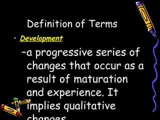 The document discusses key concepts in developmental psychology including definitions of development, growth, and maturation. It outlines basic principles like development following an orderly sequence and being influenced by both nature and nurture. Specific prenatal development stages from fertilization to birth are described week by week. Milestones of sensory, motor, emotional, cognitive, and social development from infancy through childhood are also outlined.
