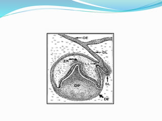 The document summarizes the development of teeth from the dental lamina stage through the bell stage. It describes how the dental lamina forms and then divides into the dental lamina and vestibular lamina. Tooth buds then form from proliferations along the dental lamina, going through the bud stage, cap stage, and bell stage as the enamel organ, dental papilla, and dental sac develop and shape the developing tooth crown. Key cell layers of the enamel organ are discussed.