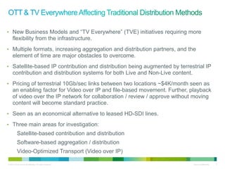 The document discusses trends in managed content distribution moving from satellite-based to IP terrestrial distribution. Key points include adopting file-based workflows and IP distribution as satellite contribution is augmented by terrestrial IP. This allows for more cost-effective playback and collaboration without moving content. It also addresses the increasing requirements for handling multiple formats, partners, and time-based aggregation and distribution of live and on-demand video content.