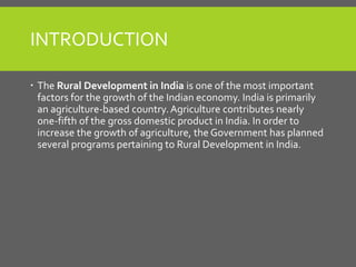 The document discusses rural development in India. It outlines several key schemes and organizations focused on rural development. The Pradhan Mantri Gram Sadak Yojana scheme aims to connect rural habitations with paved roads. The National Rural Employment Guarantee Act provides employment opportunities in rural areas. Organizations like the National Bank for Agriculture and Rural Development provide credit and support rural economic development. Overall the document examines the government's efforts to promote growth in India's important rural sectors through various programs and institutions.