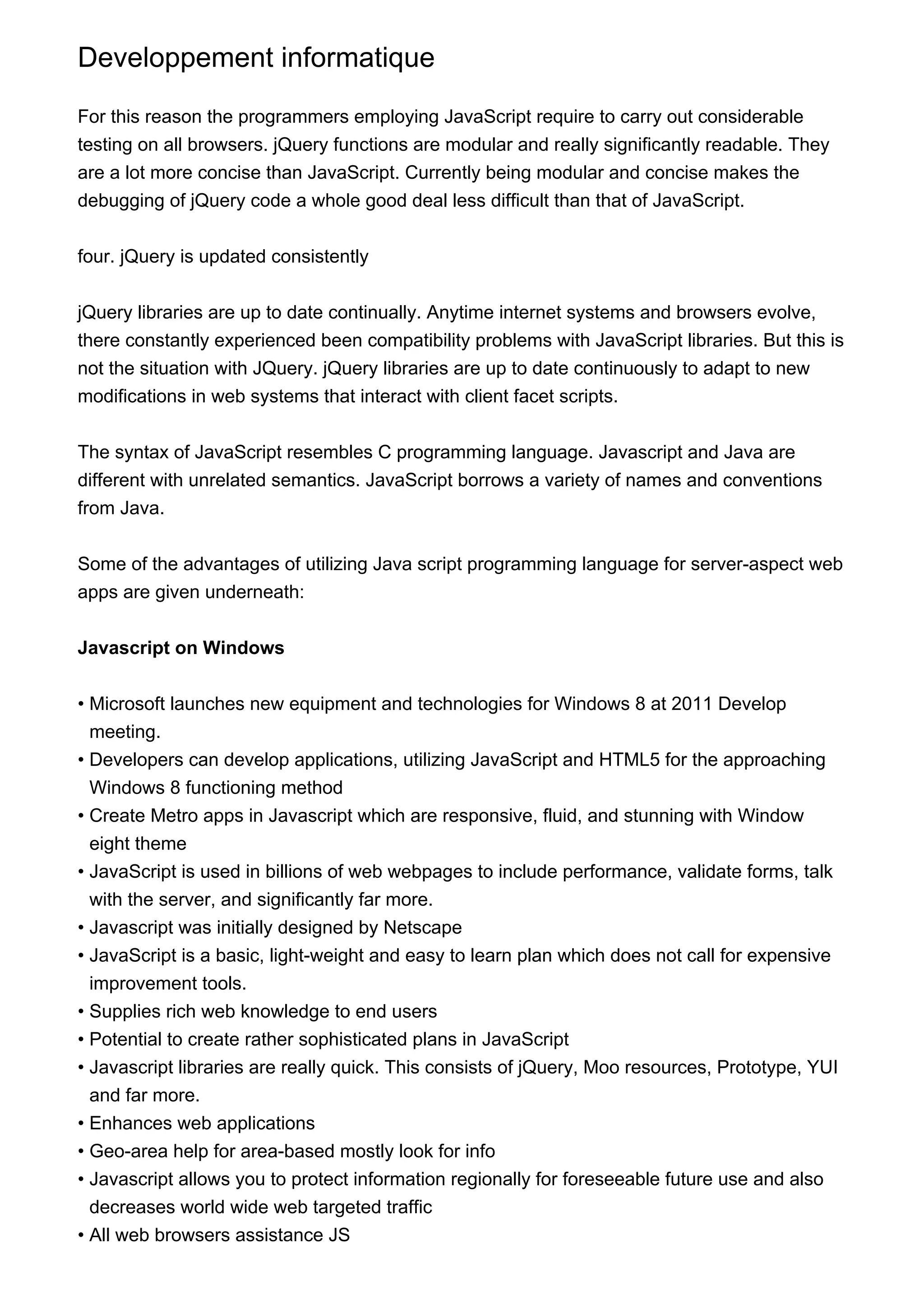 jQuery is a JavaScript library that makes coding JavaScript easier by providing modular and concise functions. It is updated regularly to maintain compatibility with evolving web standards and browsers. While JavaScript syntax resembles C, JavaScript and Java are different languages. JavaScript is commonly used for client-side web development due to its support across browsers, ability to validate forms and interact with servers, and availability of libraries like jQuery. It also allows for local data storage and geo-location capabilities in web applications.
