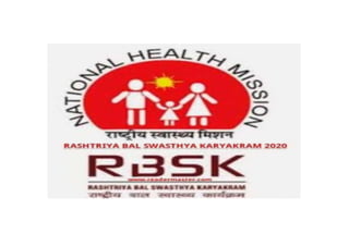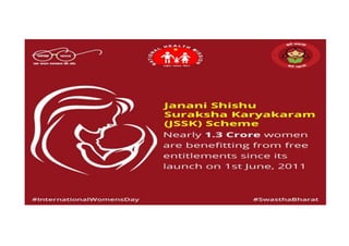 3) Specific programs like Janani Shishu Suraksha Karyakaram (JSSK) for maternal and newborn care, Rashtriya Kishor Swasthya Karyakram (RKSK) for adolescent health, and Rashtriya Bal Swasthya Karyakram (RBSK)