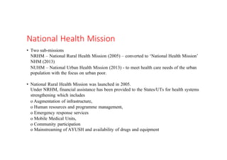 1) The National Health Mission, which includes the National Rural Health Mission and National Urban Health Mission, aimed at improving healthcare access.