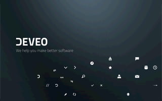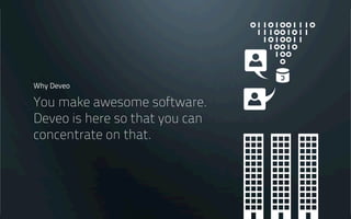 Deveo is an enterprise-class software development and collaboration platform with version control at its core. It allows securely hosting Git, Subversion, or Mercurial repositories and provides full access management with predefined roles. Developers can access Deveo either through the cloud or by installing it on-premises behind their own firewall. The platform offers automated administrative tasks, APIs, and support from Eficode through customization and consulting services.
