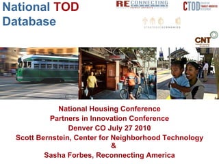 The document summarizes the National TOD Database, which is a tool created by the Center for Transit-Oriented Development to provide data on over 4,600 transit stations across the United States. The database compiles demographic, economic, and transportation data from various sources to allow analysis and comparison of neighborhoods around transit stations. It is intended to help promote sustainable development, transit planning, and research on the benefits of transit-oriented development. The document outlines the features and capabilities of the database for analyzing individual stations and transit systems.
