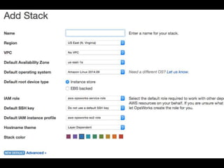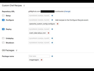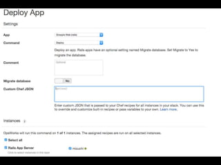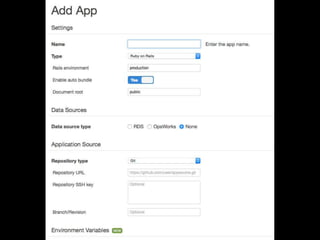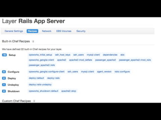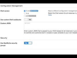1. The document discusses how OpsWorks has made the presenter's life easier as a developer who also handles operations. OpsWorks provides hosted infrastructure on AWS for deploying applications using Chef recipes.