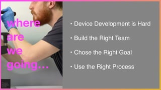 The document discusses the complexities of device development, emphasizing the importance of building the right team, selecting appropriate goals, and employing effective processes. It highlights the need for effective communication among team members and flexibility in project management to navigate the unpredictability of the development process. The insights are drawn from Ian Macduff's extensive experience in product creation and development.