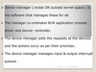 3) Device management involves polling, interrupts, and DMA and supports various I/O approaches including programmed, interrupt-driven, and DMA-driven I/O.