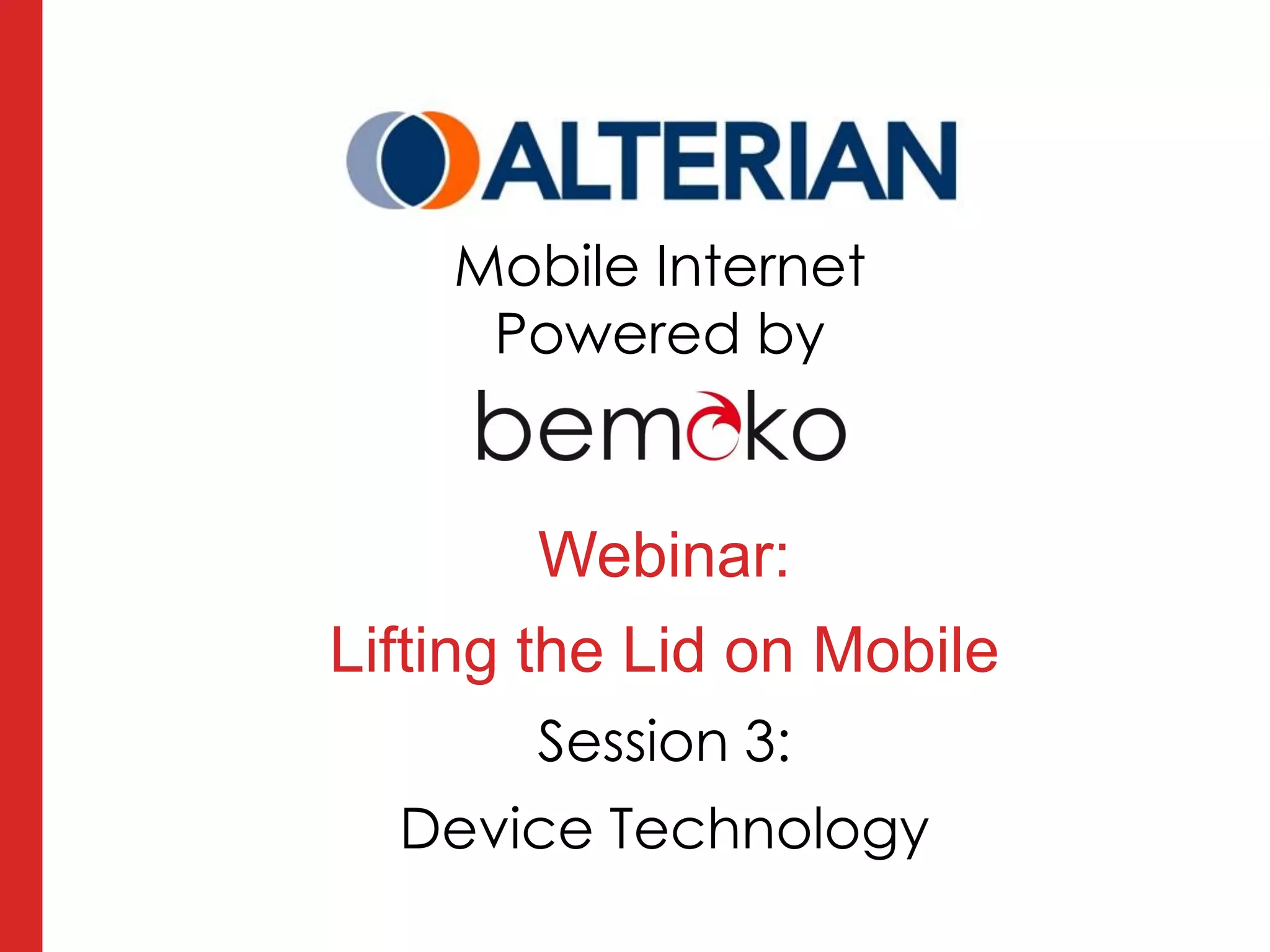 The webinar discusses the rapid evolution of mobile device technology and its implications for marketing, emphasizing the importance of understanding various handsets, operating systems, and advanced features like GPS and NFC. Key marketing applications are identified, including location-based advertising and customer interaction tools. The session also highlights the growing diversity of devices and the need for cross-platform strategies to maximize user experiences.