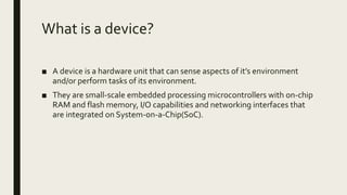 This document discusses devices, gateways, and their roles. A device is a hardware unit that can sense its environment and perform tasks using a microcontroller, memory, I/O capabilities and networking interfaces. Devices can be basic, providing only sensor readings and actuation, or advanced, hosting applications and providing user interfaces. Gateways translate between network layers, manage data from multiple devices, run local applications, and facilitate device management between devices and servers.