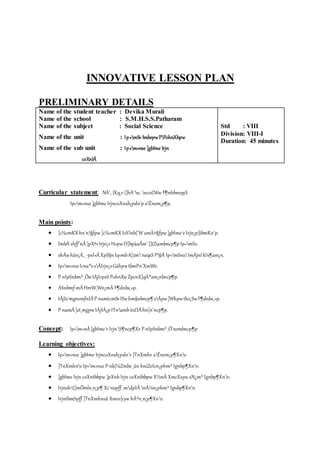 This document contains an innovative lesson plan created by Devika Murali, a student teacher, for an 8th standard Social Science class. The lesson plan aims to teach students about the traditional practices followed in families during ancient times in Kerala. It includes details of the lesson such as the objectives, content, teaching methods, and evaluation. The lesson uses activities like discussion, group work and presentations to help students understand that families in ancient Kerala were typically patriarchal, with the father holding authority and responsibilities over domestic affairs.