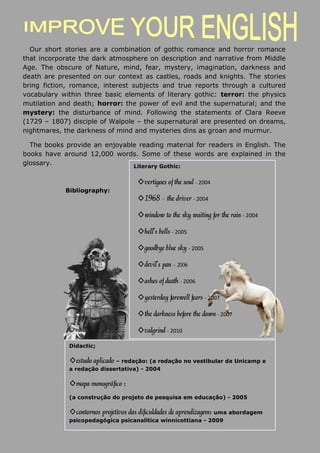 The document describes a collection of short stories that blend gothic romance and horror romance, set against a dark, medieval atmosphere. It emphasizes themes of terror, horror, and mystery, using rich vocabulary and various literary elements to engage readers. The works, totaling around 12,000 words, include a glossary and aim to provide enjoyable reading experiences in English.