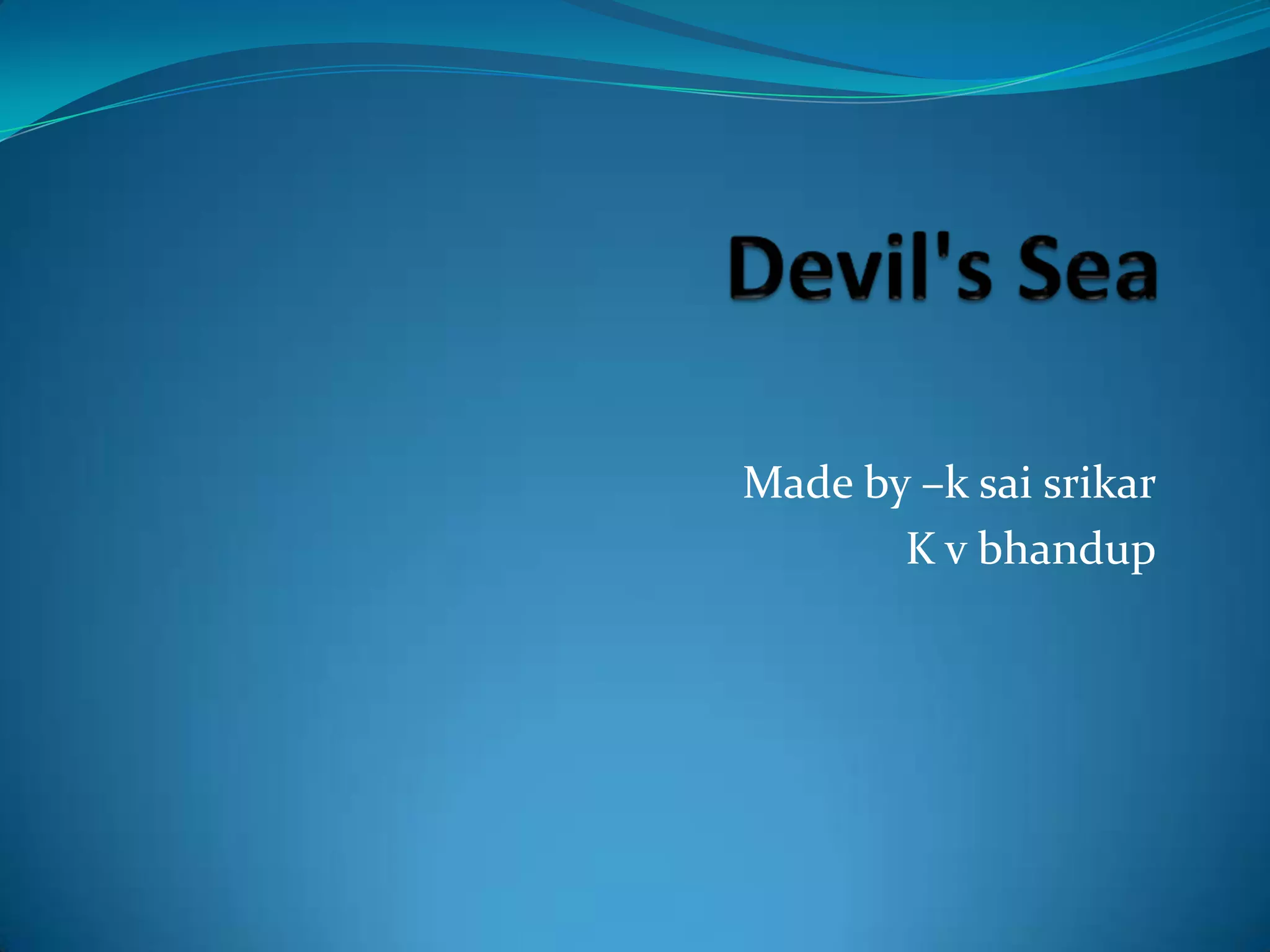 The document discusses the Devil's Sea, also known as the Dragon's Triangle, an area of the Pacific Ocean located off the coast of Japan known for mysterious disappearances and anomalies. In 1952, the Japanese government sent a research vessel, the Kaio Maru No. 5, to investigate the area, but the ship and its 31 crew members disappeared without a trace. Theories for what occurs in the region include volcanic activity, methane gas eruptions from hydrates on the ocean floor, and even portals to other dimensions. The name "Dragon's Triangle" comes from a Chinese legend of dragons living beneath the sea in that area.