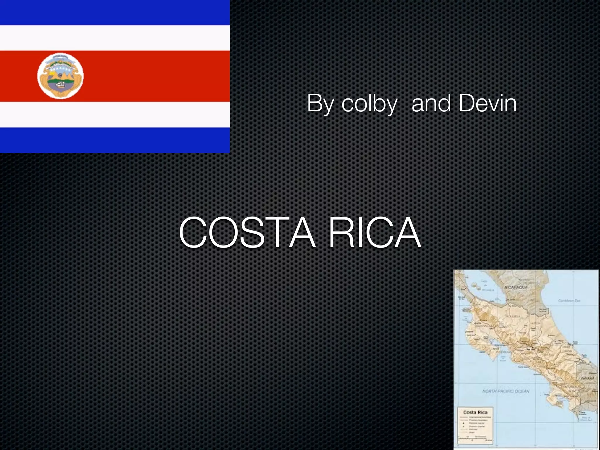Costa Rica has many vacation opportunities such as beaches ideal for surfing and hot springs near the Arenal volcano. However, visitors should be cautious of theft and not bring valuables. The cuisine features black beans, soups, tilapia, and flan. Wildlife includes dolphins, whales, snakes, and diverse bird species, though snakes can be dangerous. Traditional dancing lessons are available.