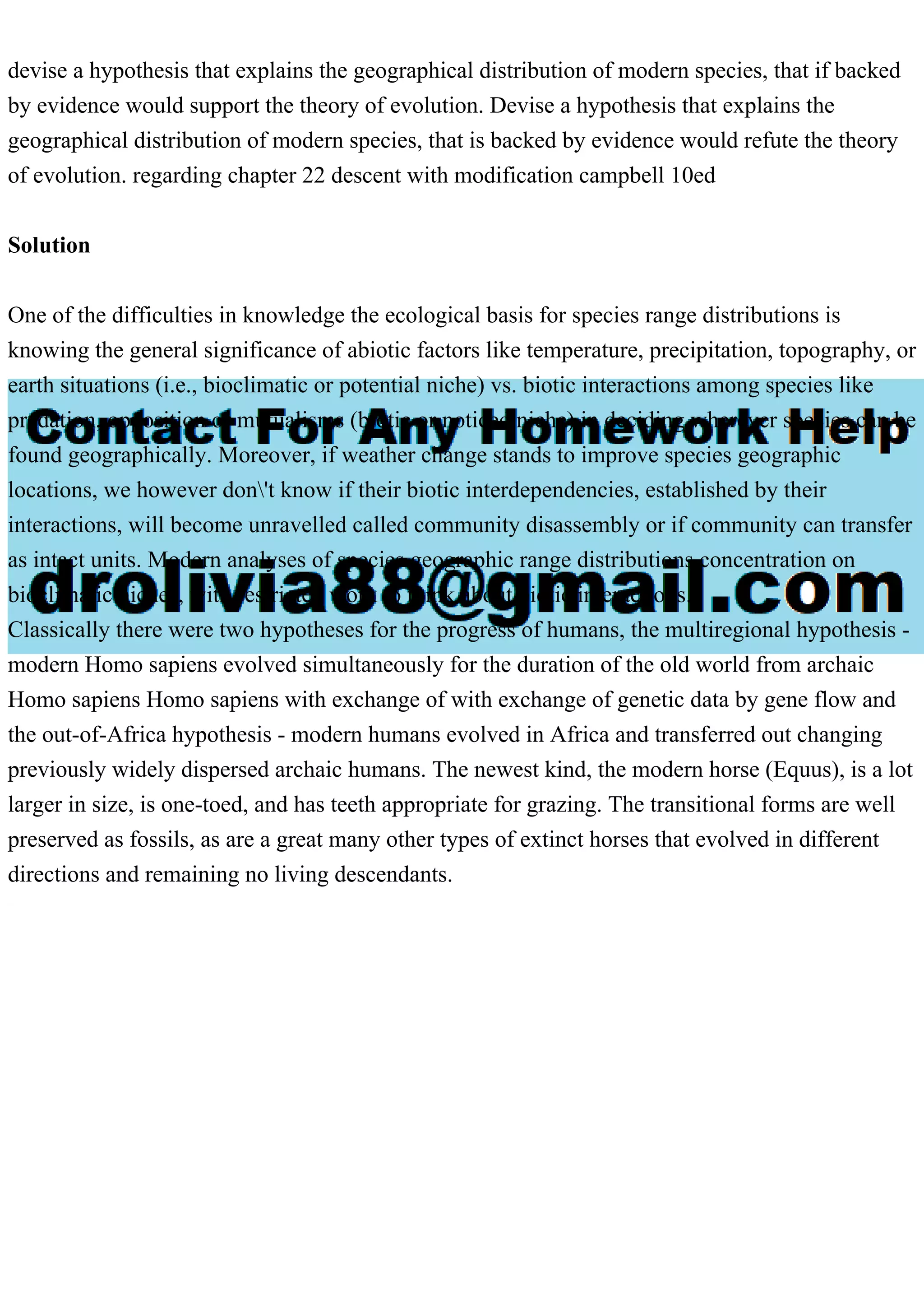 The document discusses hypotheses regarding the geographical distribution of modern species in the context of evolution, including the significance of abiotic factors and biotic interactions. It evaluates competing theories of human evolution, namely the multiregional hypothesis and the out-of-Africa hypothesis, while also touching on the evolution of horses. Additionally, it highlights the challenges of understanding species range distributions amidst climatic changes and community dynamics.