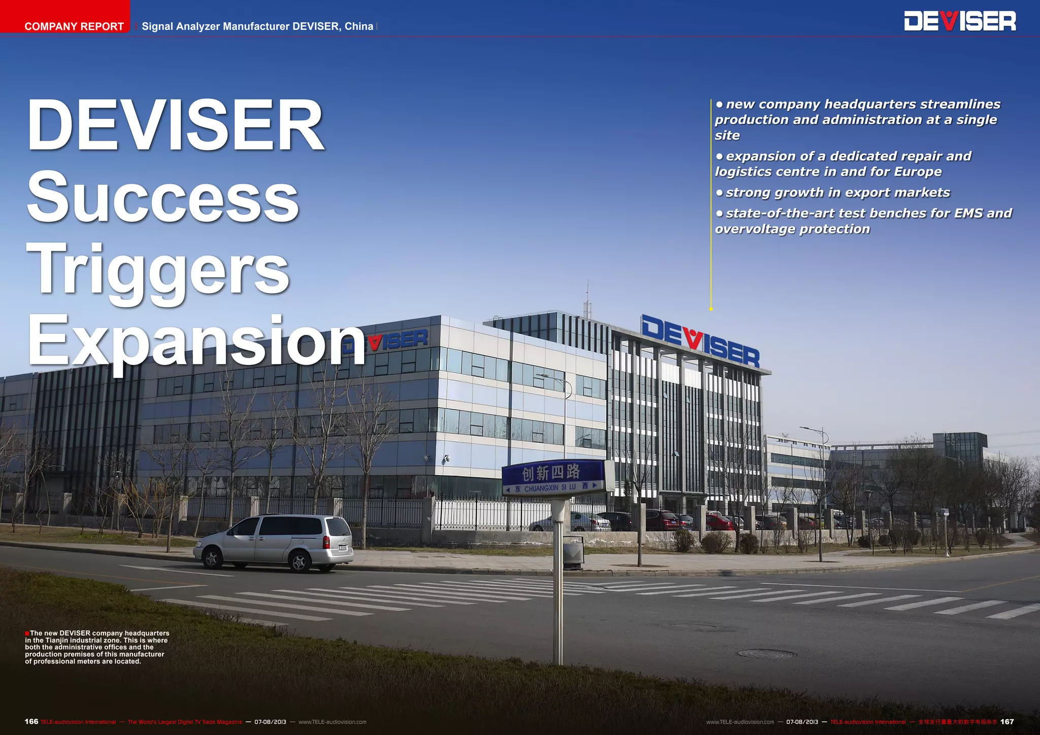 The document discusses Chinese company DEVISER, a manufacturer of professional signal meters. DEVISER has experienced strong growth in recent years, leading them to expand their operations. This includes constructing a new, large company headquarters that consolidates their production and administration under one roof. DEVISER also plans to open a repair and logistics center in Europe to better serve those export markets. A majority of DEVISER's products are now sold internationally, with the largest markets being the United States, Southeast Asia, and Europe. The new headquarters positions DEVISER for continued growth in the global high-quality meter market.