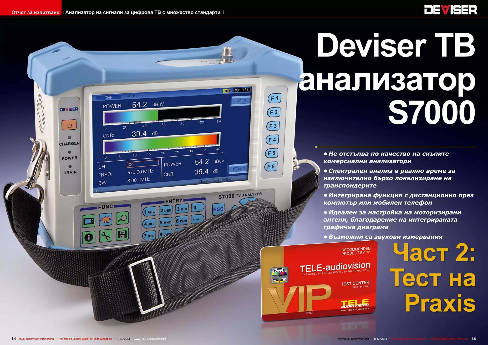 This document provides a test report for the Deviser S7000 multi-norm digital TV signal analyzer in two parts.