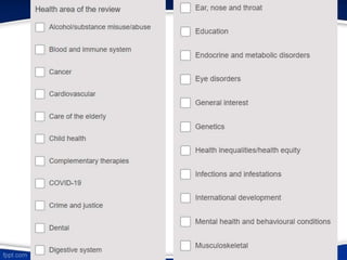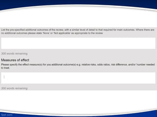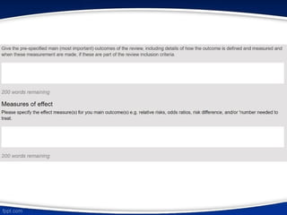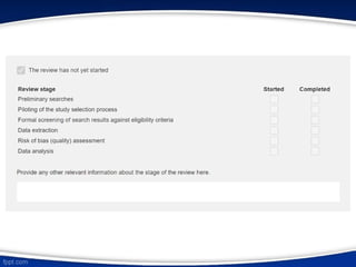 The document outlines guidelines for conducting systematic reviews, emphasizing the importance of a clear title utilizing the PI(E)COS structure, outlining expected start and completion dates, identifying the review team and their affiliations, and detailing potential conflicts of interest. It specifies procedures for defining review questions, participant criteria, interventions, and outcomes, along with search strategies and data extraction methods. Additionally, it discusses assessing risk of bias and strategies for data synthesis, providing examples to illustrate the required details for each component.