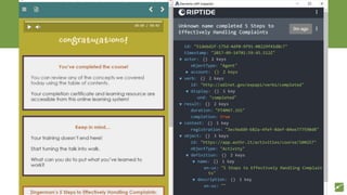 xAPI is a specification for recording and storing data about learning experiences across systems. It aims to replace SCORM by allowing interoperability across platforms and functions. The presentation provides an overview of xAPI and guidance on getting started with it, including picking small pilot projects, sending data to a Learning Record Store, connecting authoring tools and LMSs to record and receive xAPI data, and starting to phase out reliance on SCORM. It also discusses related specifications and standards like cmi5, LRS conformance, and xAPI profiles that are important for implementation.