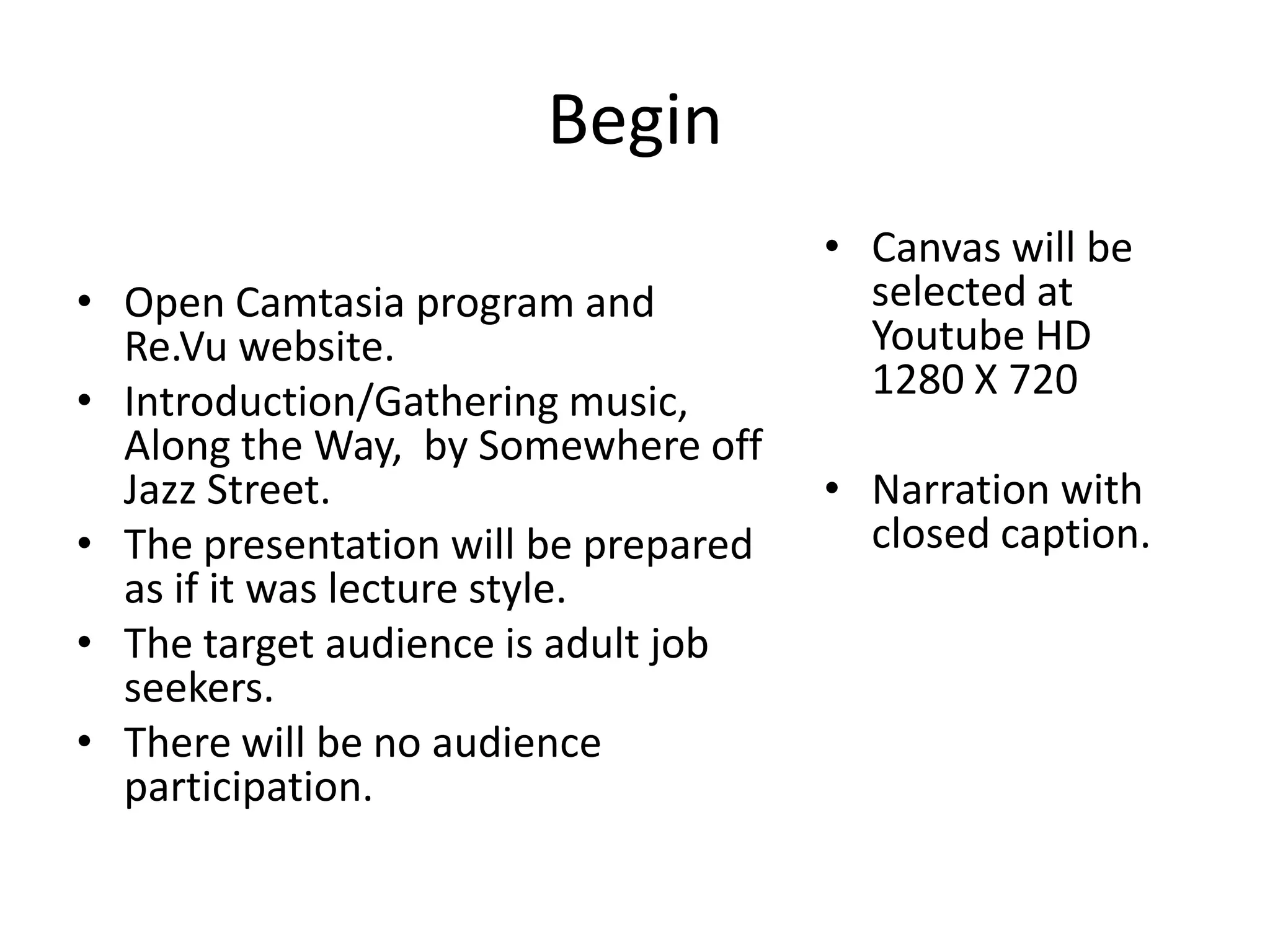 The document provides instructions for creating a presentation using Camtasia about the Re.Vu website, which allows users to create visual resumes. The presentation will be narrated and include screenshots of the Re.Vu website demonstrating how to sign up, import information from LinkedIn, and populate profile sections like work history, education, skills and infographics. The presentation concludes with a sample visual resume created on Re.Vu.