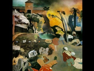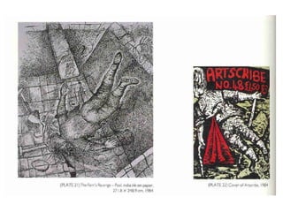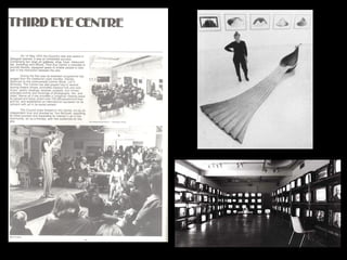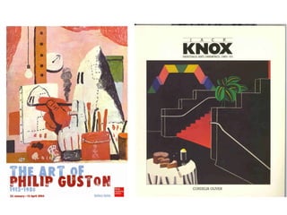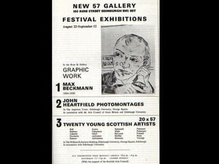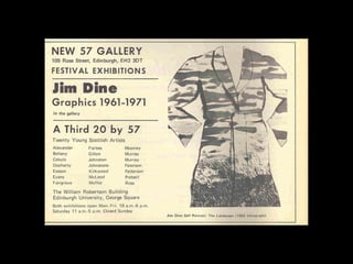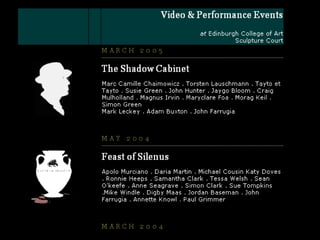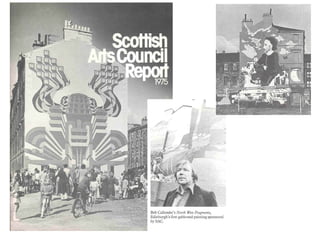 The document summarizes the development of Scottish art from the late 19th century to the early 2000s, mentioning several important artistic movements, galleries, publications and individual artists that contributed to Scottish art during this period. Key points included Myth Makars in the 1890s, the Spook School in the 1980s, New Image Glasgow in the 1990s, the Richard Demarco Gallery in the 1960s-70s, influential magazines like Rocket and publications by artists like Alan Bold. Individual artists mentioned include Douglas Gordon, Peter McCaughey, Katy Dove, Keith MacIsaac and others.
